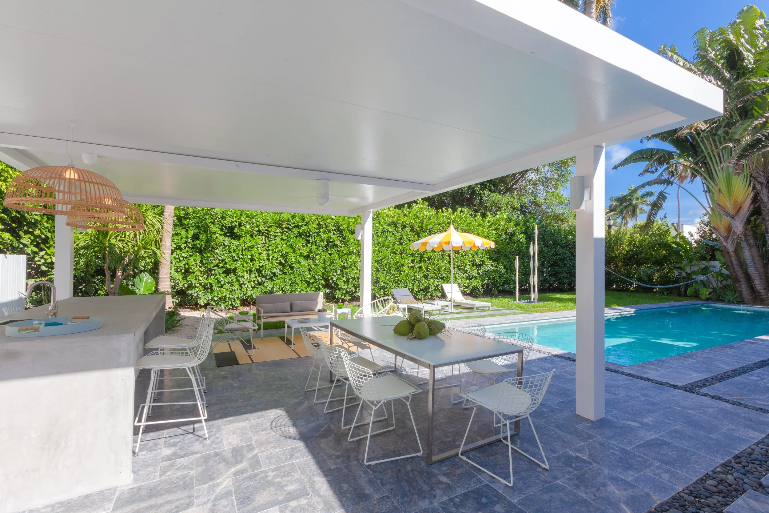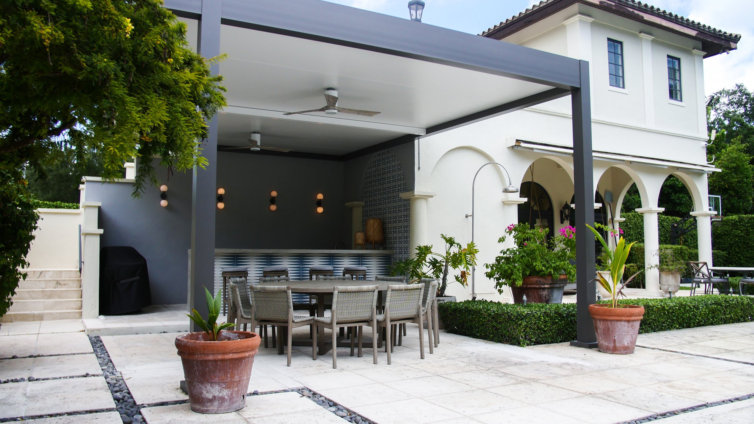 Insulated roof designed to keep the patio cool throughout the day by deflecting sun rays.