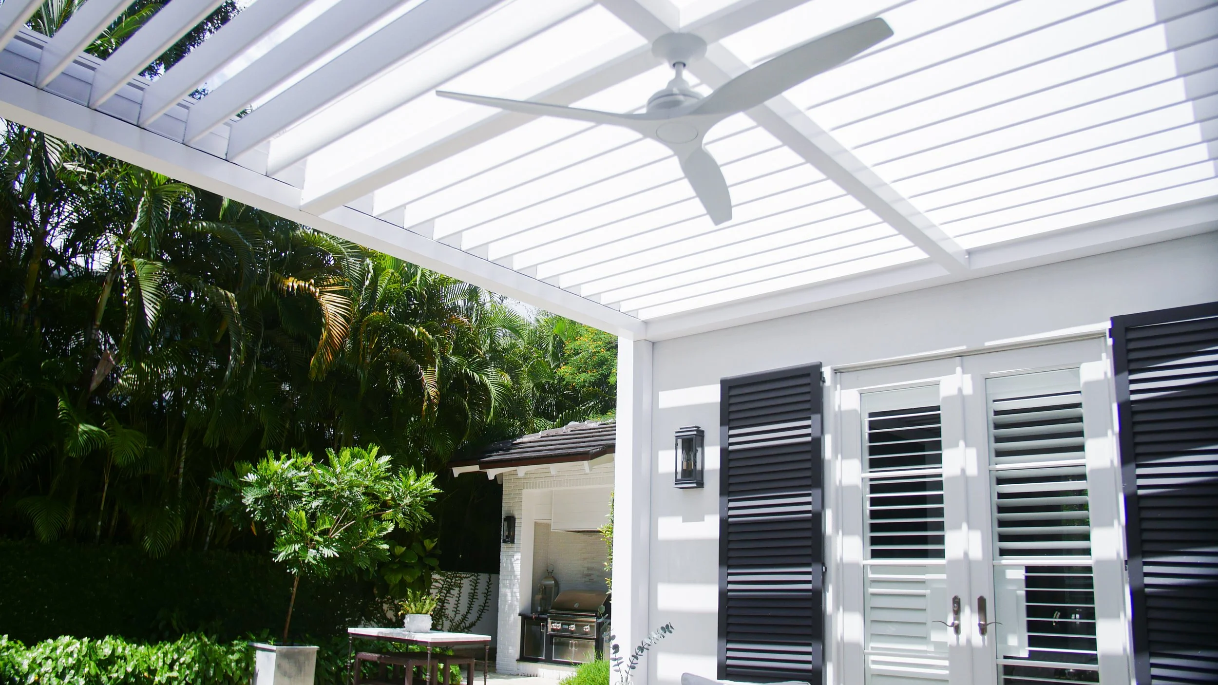 Insulated roof designed to keep the patio cool throughout the day by deflecting sun rays.